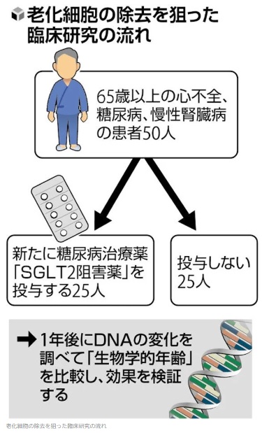老化細胞は細胞分裂を終えた後も死なずに蓄積した細胞で、周囲に炎症を引き起こし、様々な病気の原因になる。南野教授はマウスの実験で、尿への糖の排出を促す糖尿病治療薬「SGLT2阻害薬」が老化細胞を除去して、糖尿病や動脈硬化、虚弱(フレイル)を改善する効果があることを明らかにした。早老症のマウスでは寿命を延ばす効果も確認され、論文が昨年、科学誌「ネイチャー・エイジング」に掲載された。